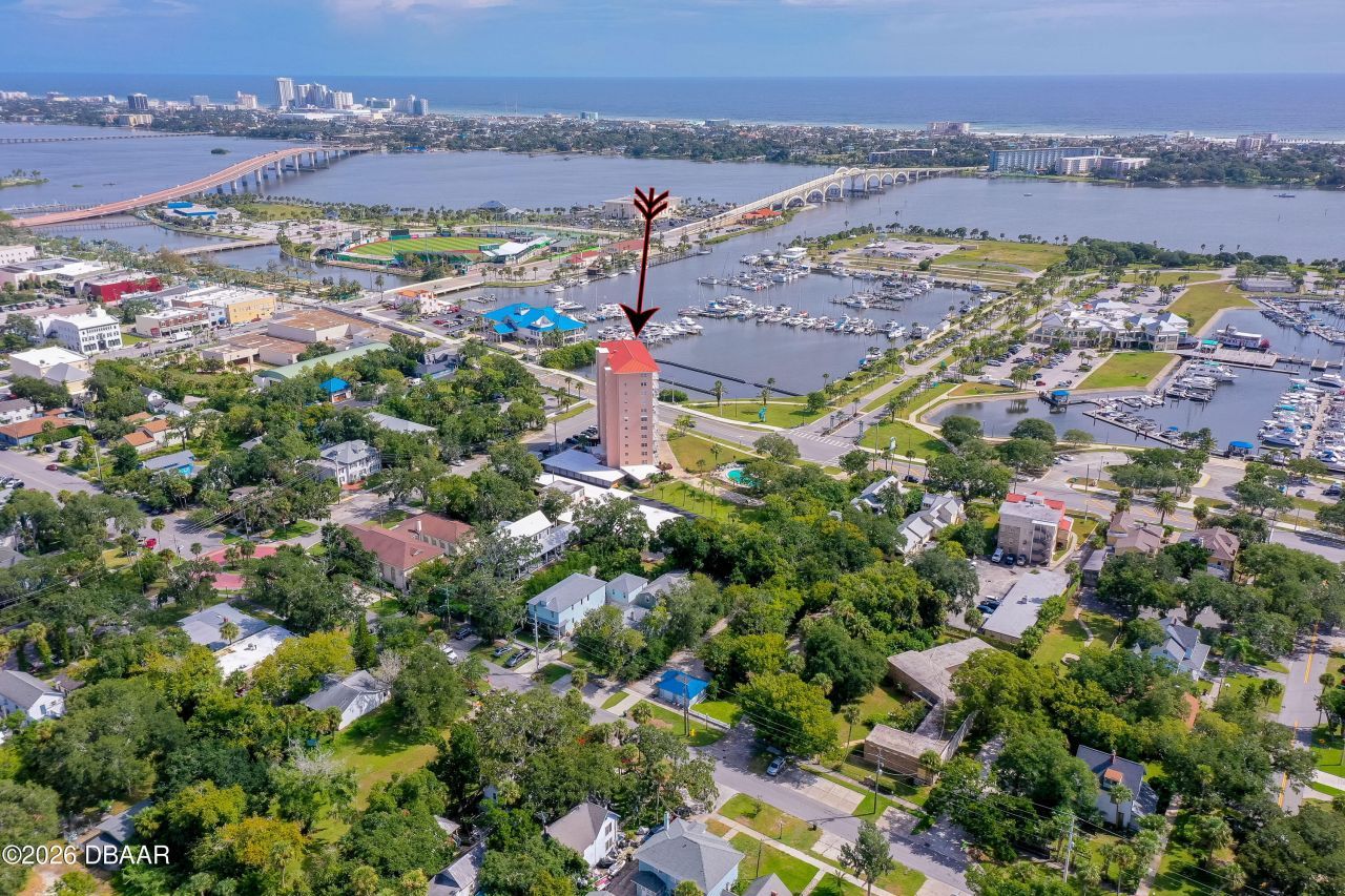 PREPARE TO BE IMPRESSED the moment you step into this updated 5th-floor condo boasting a true million-dollar panoramic view " marinas, the Intracoastal, spectacular sunrises and sunsets, fireworks from Jackie Robinson Ballpark, and even rocket launches lighting up the sky. Designed for both comfort and style, this residence features an updated kitchen and bath, French doors from both the living room and bedroom leading to your private balcony, ample closet space, with a large storage area in the hall outside your front door. Additional highlights include a full-size washer/dryer, a detached one-car garage space, and access to the community pool. Ideally located within walking distance to vibrant Riverfront Esplanade, Brownie's dog park, the Halifax River Yacht Club, shops, restaurants, museums, and Jackie Robinson Ballpark. The building has completed major improvements including a new roof on the condo building and garages, concrete restoration, fresh stucco and paint, new elevators, and new balconies and railings.Management reports no upcoming assessments. Cats allowed. No dogs except service animals. 1-month minimum rental with 1-year preferred. Pet policy: Up to two cats permitted. No dogs except service animals.