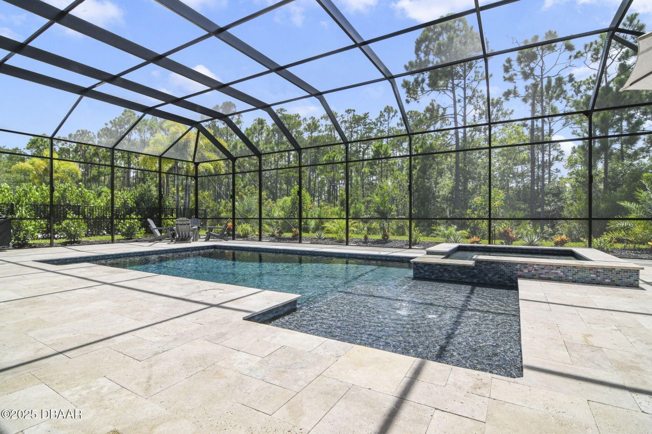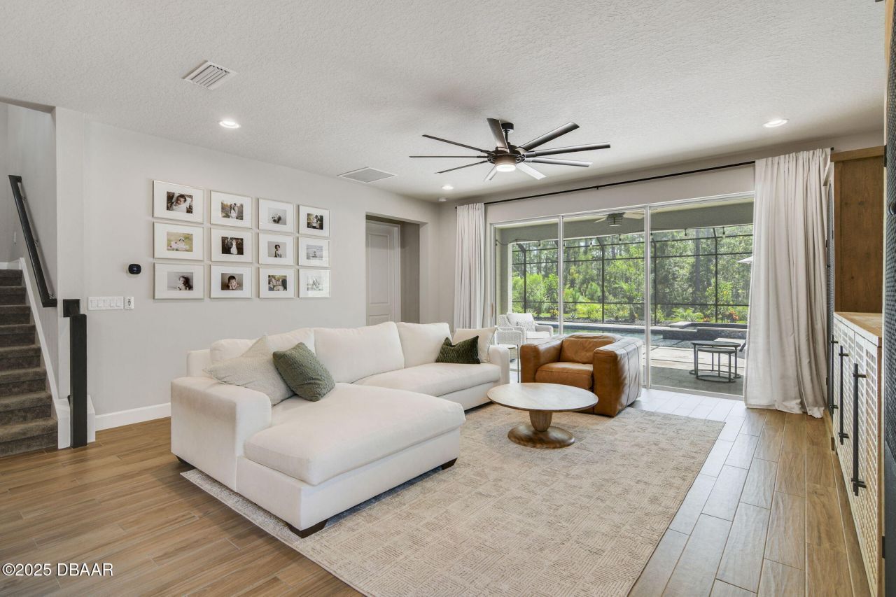Fall in love with this extraordinary five-bedroom, three-and-a-half-bath home, perfectly situated in the exclusive gated community of Woodhaven. From the moment you arrive, you'll be captivated by its curb appeal"complete with a charming front porch, a full three-car garage, and a private screened-in heated pool and spa that feels like your own personal resort. Inside, every detail has been thoughtfully curated for modern living, with stunning tile plank flooring, custom plantation shutters, and designer lighting that adds warmth and style throughout the main level. The heart of the home is the chef's dream kitchen, featuring luxurious quartz countertops, top-of-the-line stainless steel appliances, elegant white cabinetry with crown molding, a wine cooler, and a spacious island with seating"ideal for everything from morning coffee to evening gatherings. The open living area is perfect for entertaining, with triple sliding glass doors that bring the outside in, leading to a breathtaking travertine-tiled lanai and pool backing up to the greenbelt. Unwind in the serene first-floor primary suite, featuring a custom accent wall, dual vanities, and a walk-in shower. A second bedroom, a private office or den, and a stylish half bath complete the main level. Upstairs, a generous bonus room serves as a fun-filled game room, surrounded by three additional bedrooms and two full bathrooms, perfect for guests or a growing family. Located minutes from top-rated schools, parks, golf courses, dining, shopping, and the iconic beaches of Daytona, this home offers the lifestyle you've been dreaming of. Homes like this don't come along often, schedule your private showing today!