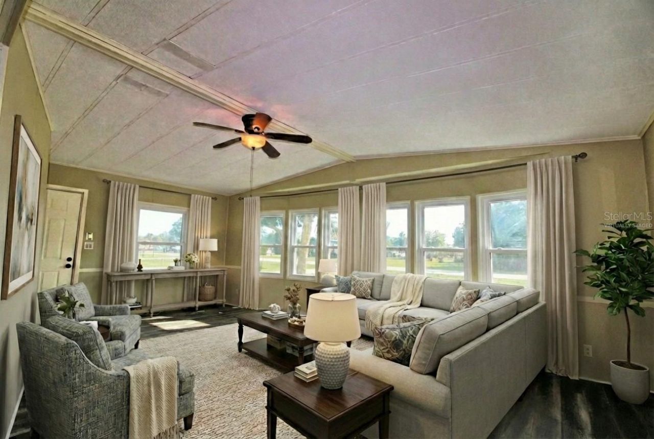 One or more photo(s) has been virtually staged. Well-maintained 2-bedroom and 2-bathroom double-wide in Laurelwood Mobile Estates, a quiet 55+ community in Port Orange. Spacious 1,392 SF living area on a landscaped lot with private irrigation well/pump. Upgrades include 2023 HVAC, 2017 roof, and 2014 windows. Interior features vinyl flooring, ceiling fans, kitchen island, pantry, wet bar, and inside laundry. Primary suite includes walk-in closet and en-suite bathroom. Exterior highlights include screened patio, carport, and extra storage. No rentals allowed (except grandfathered owners). Optional HOA ($25/year) supports signage and lighting, and administrative costs. Located near Port Orange PD and Water Treatment Plant - helps prevent power outages during storms. Close to shopping, dining, and medical.